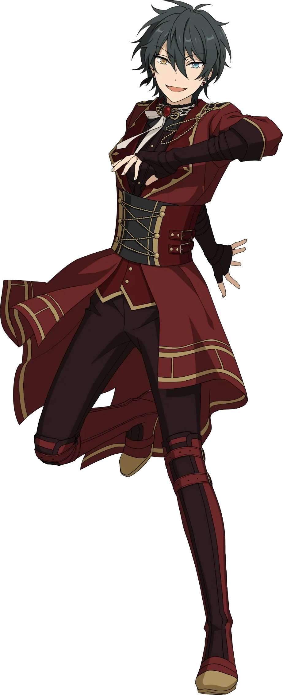 VISUAL: | reference |Most notable is his heterochromia; one gold eye and one blue. His hair is styled but it has a purposefully messy sort of look to it. He is very thin and on the petite side, although just how noticeable it is depends on what he's wearing as he likes to wear some outfits that are purposefully baggy and loose on him.